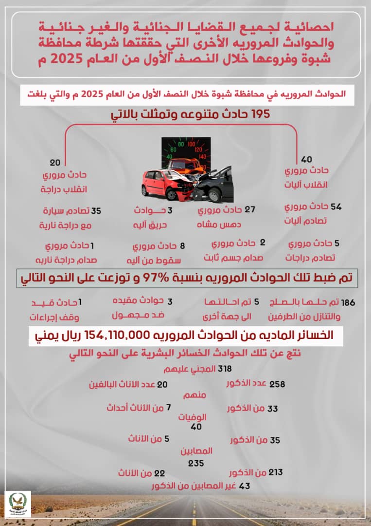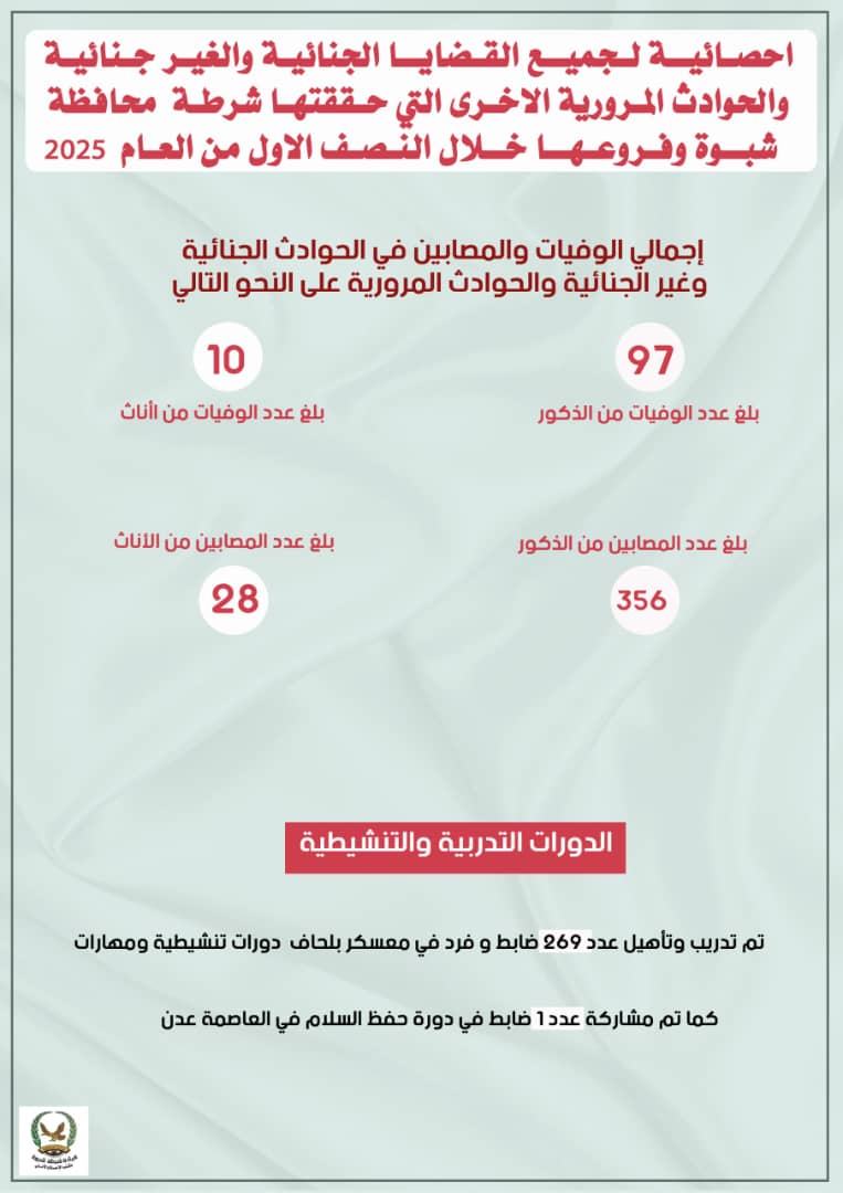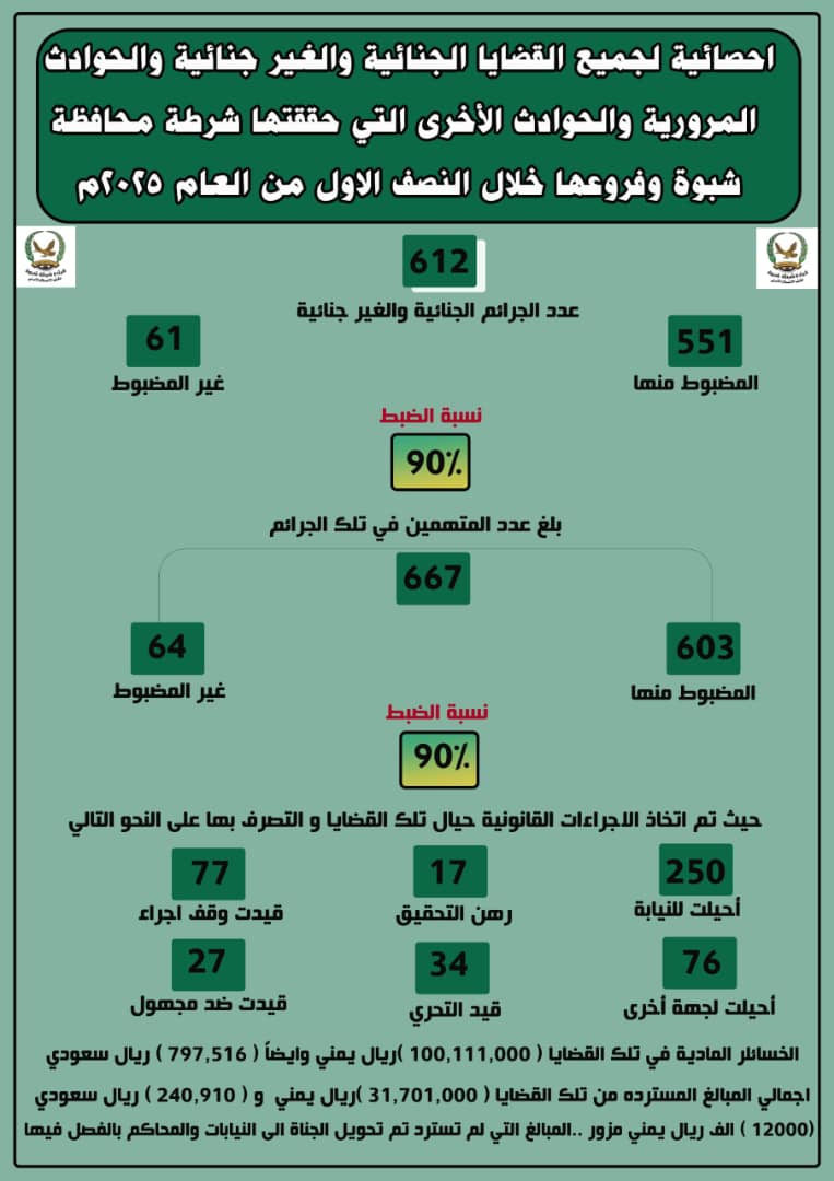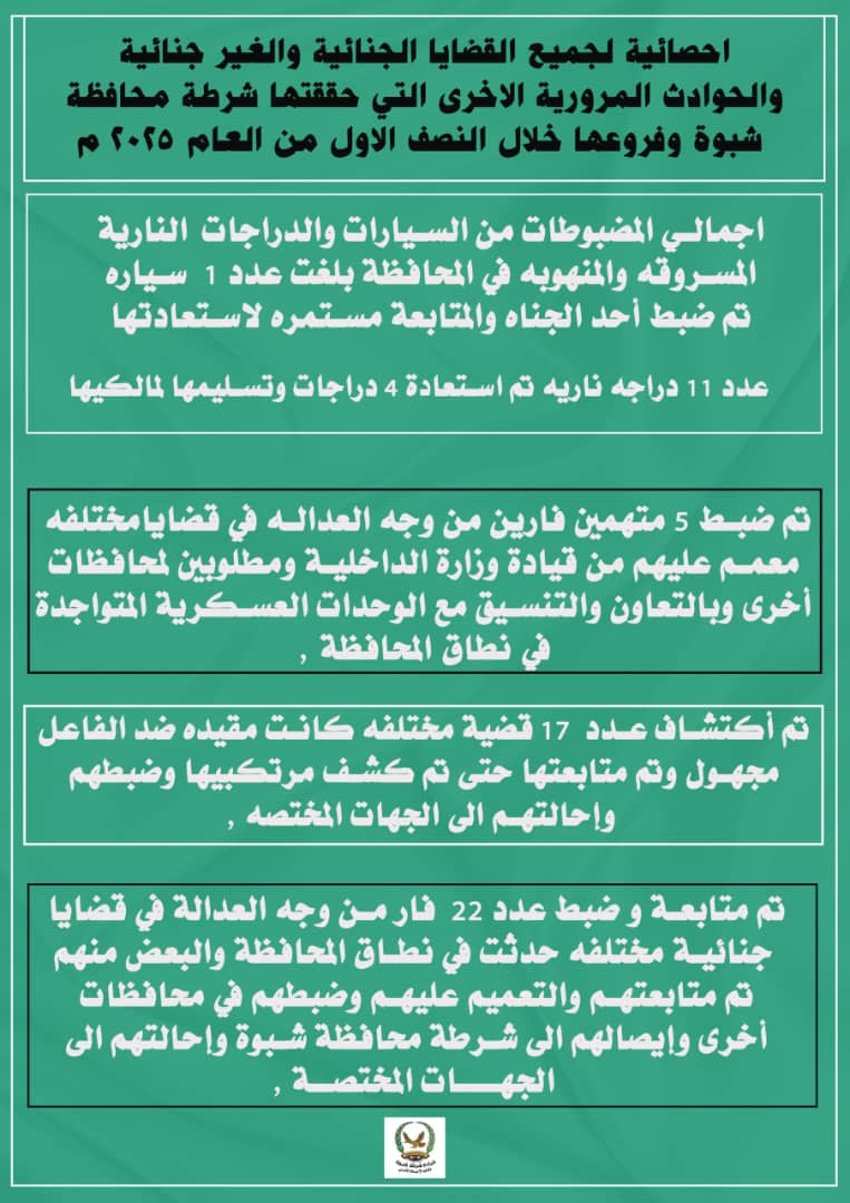 تؤكد نتائج النصف الأول من 2025 أن شرطة شبوة مستمرة في أداء واجبها الوطني بكل كفاءة واقتدار، رغم التحديات الراهنة، مع عزم على المزيد من الإنجازات لتعزيز أمن واستقرار المحافظة، وتحقيق حياة آمنة للمواطنين.