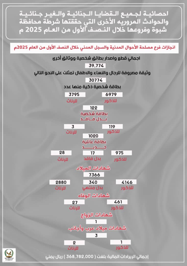 – مصلحة الأحوال المدنية والسجل المدني: إصدار 39,774 وثيقة، شملت بطاقات ذكية وشهادات ميلاد ووفاة وزواج، حققت إيرادات بقيمة 368,782,000 ريال يمني.
