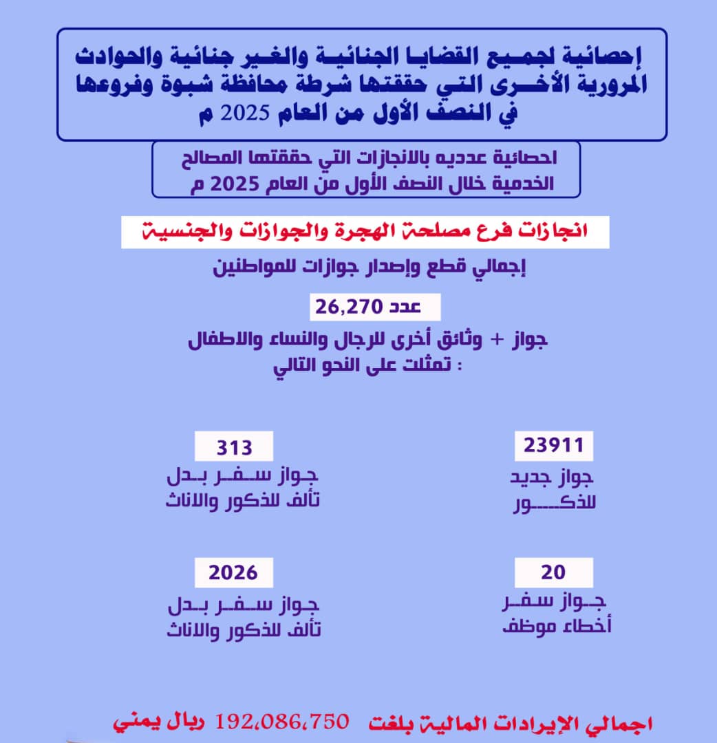 – مصلحة الهجرة والجوازات والجنسية: إصدار 26,270 جواز سفر ووثائق أخرى، وإيرادات بلغت 192,086,750 ريال يمني.