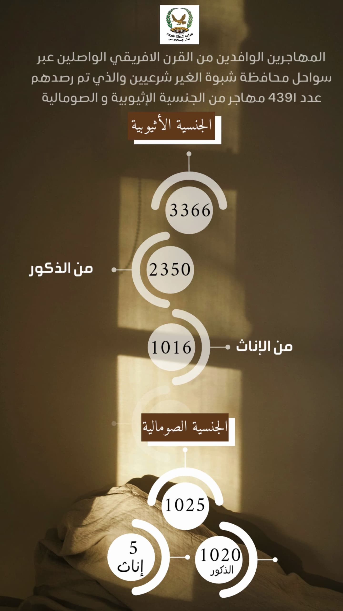 تم رصد وصول 4,391 مهاجر غير شرعي عبر سواحل المحافظة، منهم 3,366 من الجنسية الإثيوبية، و1,025 من الجنسية الصومالية، منهم غالبية من الذكور، وأنجزت القوات إجراءات التحقق والمتابعة.