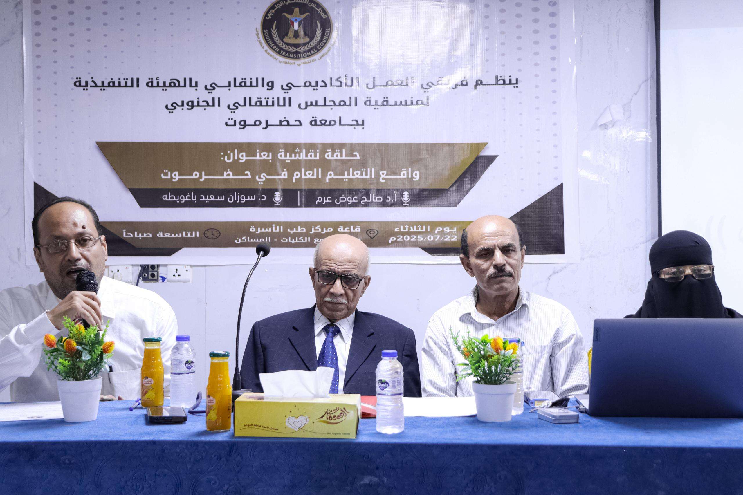 نظّم فريقا العمل الأكاديمي والنقابي في الهيئة التنفيذية لمنسقية المجلس الانتقالي الجنوبي بجامعة حضرموت، اليوم الثلاثاء، حلقة نقاشية بعنوان “واقع التعليم العام في حضرموت”، وذلك بهدف الارتقاء بمستوى العملية التعليمية وتعزيز الوعي بأهميتها كدعامة أساسية لبناء الدولة.