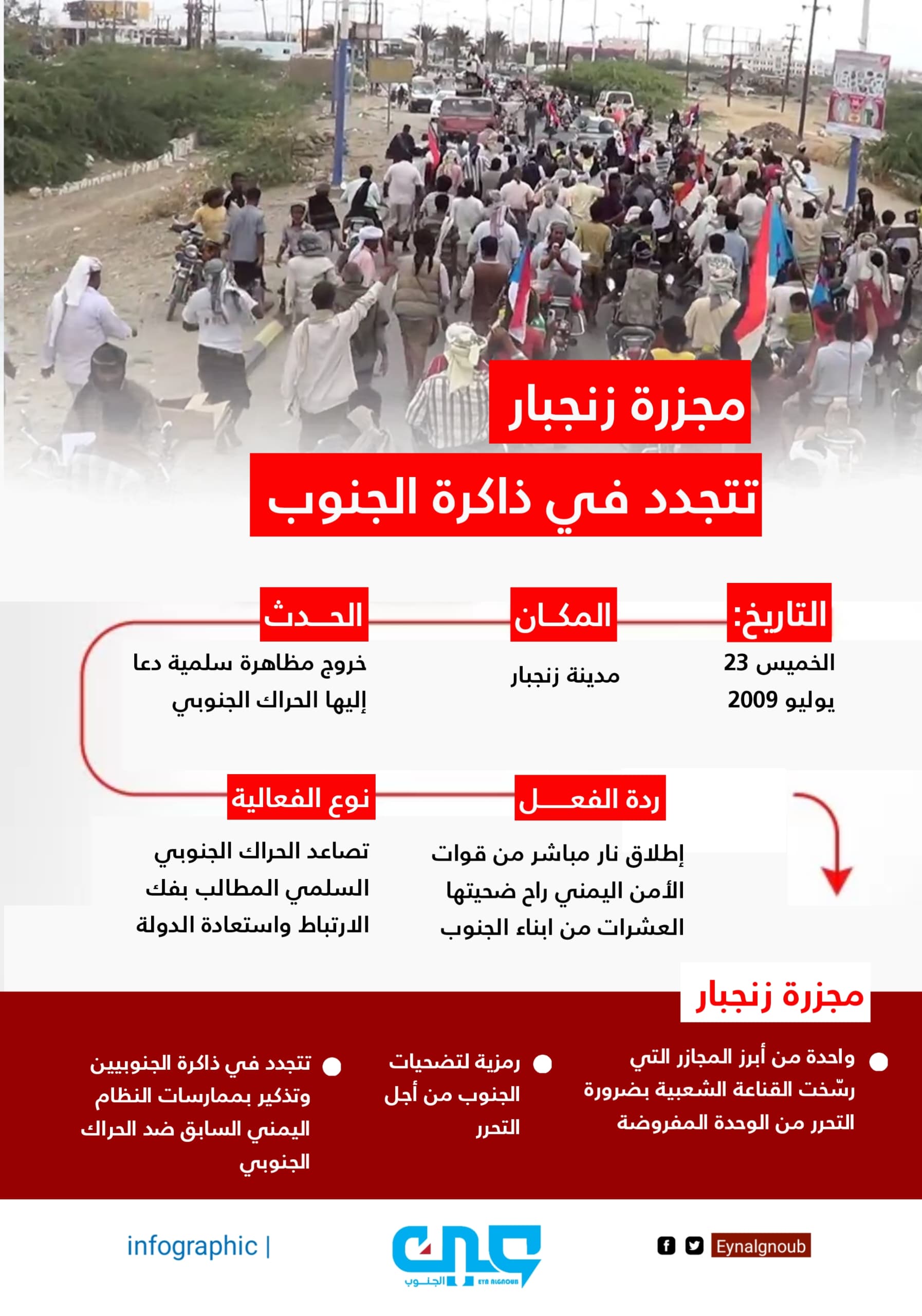 في زنجبار، في صباح 23 يوليو 2009، ابناء الجنوب اجتمعوا على هدف واحد، أن يعيشوا في وطن حر، بلا قهر، بلا تهميش، بلا احتلال يمني حاول تذويب هوية شعب الجنوب وطمس دولته. هناك، رفع الناس أصواتهم، رافعين رايات لا تطلب إلا الحق. وبينما كانت الكلمات تنبعث حاملة رسائل وطن وشعب، كانت رصاصات الاحتلال اليمني التابعة لصالح تتحين لحظة الغدر. لم تمر دقائق حتى تحوّلت الساحة إلى دماء.