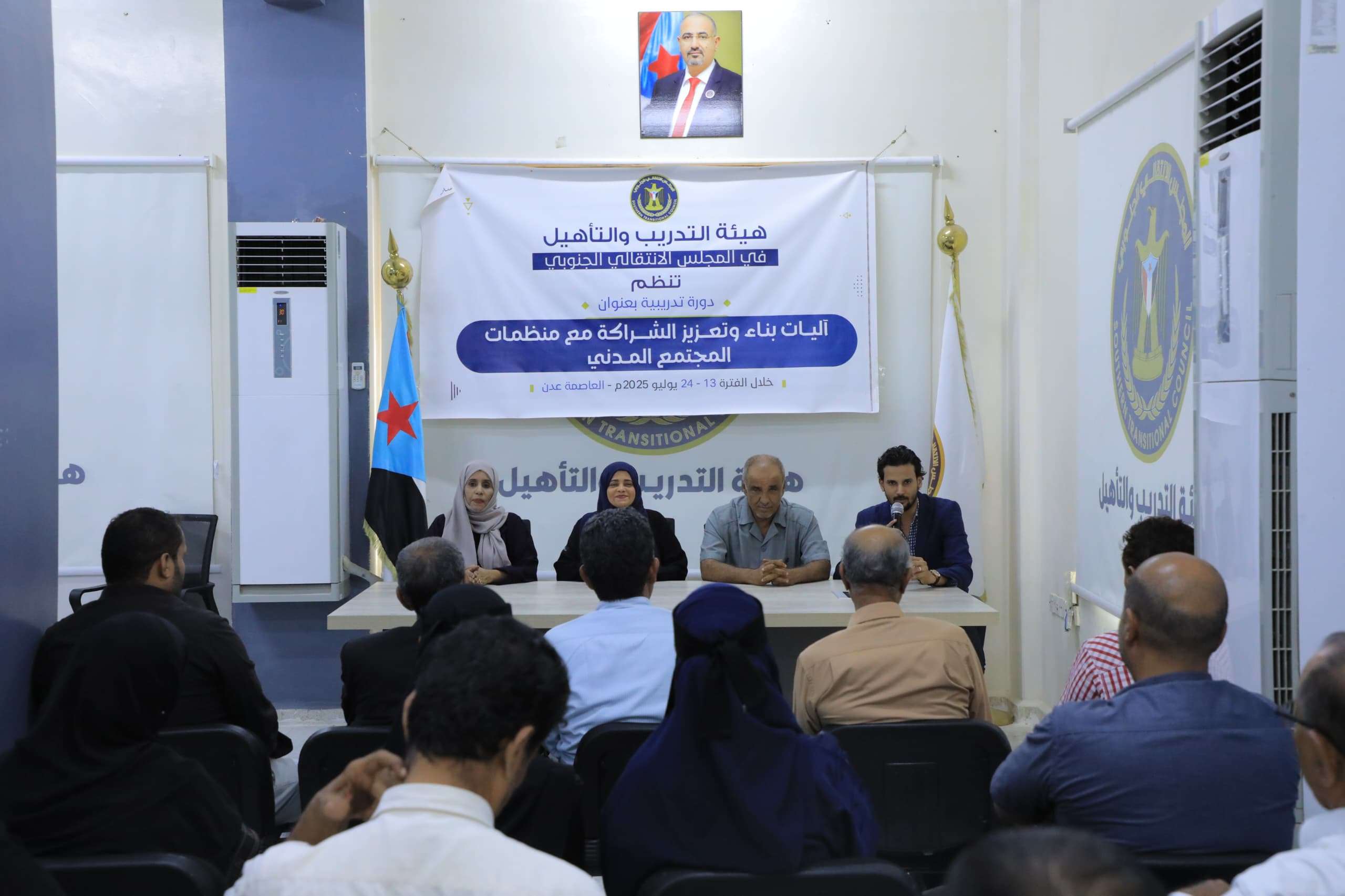 اختتمت هيئة التدريب والتأهيل المساعدة لهيئة رئاسة المجلس الانتقالي الجنوبي، اليوم الخميس، دورة تدريبية بعنوان “آليات بناء وتعزيز الشراكة مع منظمات المجتمع المدني”، والتي استهدفت عددًا من كوادر المجلس الانتقالي الجنوبي من ذوي الاختصاص.