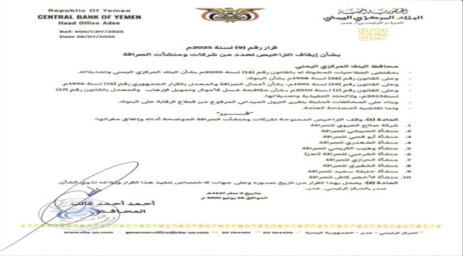 أصدر محافظ البنك المركزي أ. أحمد أحمد غالب، القرار رقم (9) لعام 2025م، بشأن ايقاف التراخيص الممنوحة لعددٍ [10] من شركات ومنشات الصرافة المخالفة والمثبتة بتقرير النزول الميداني المرفوع من قطاع الرقابة على البنوك.