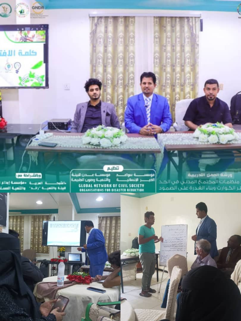 في إطار النشاطات التي تشهدها مؤسستا سواعد الخيرية الإنسانية ومؤسسة عدن للبيئة والتنمية المستدامة وصون الطبيعة نظّمت صباح اليوم بمدينة الشعب بالعاصمة عدن ورشة عمل تدريبية تحت عنوان: “تعزيز دور منظمات المجتمع المدني في الحد من مخاطر الكوارث وبناء القدرة على الصمود”.