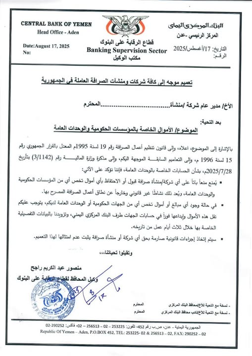 ​وبحسب التعميم المؤرخ في 17 أغسطس 2025، والذي يحمل توقيع الأستاذ منصور عبد الكريم راجح، وكيل المحافظ لقطاع الرقابة على البنوك، فإنه يُحظر على أي بنك أو شركة أو منشأة صرافة قبول أو الاحتفاظ بأي أموال تخص المؤسسات الحكومية والوحدات العامة.