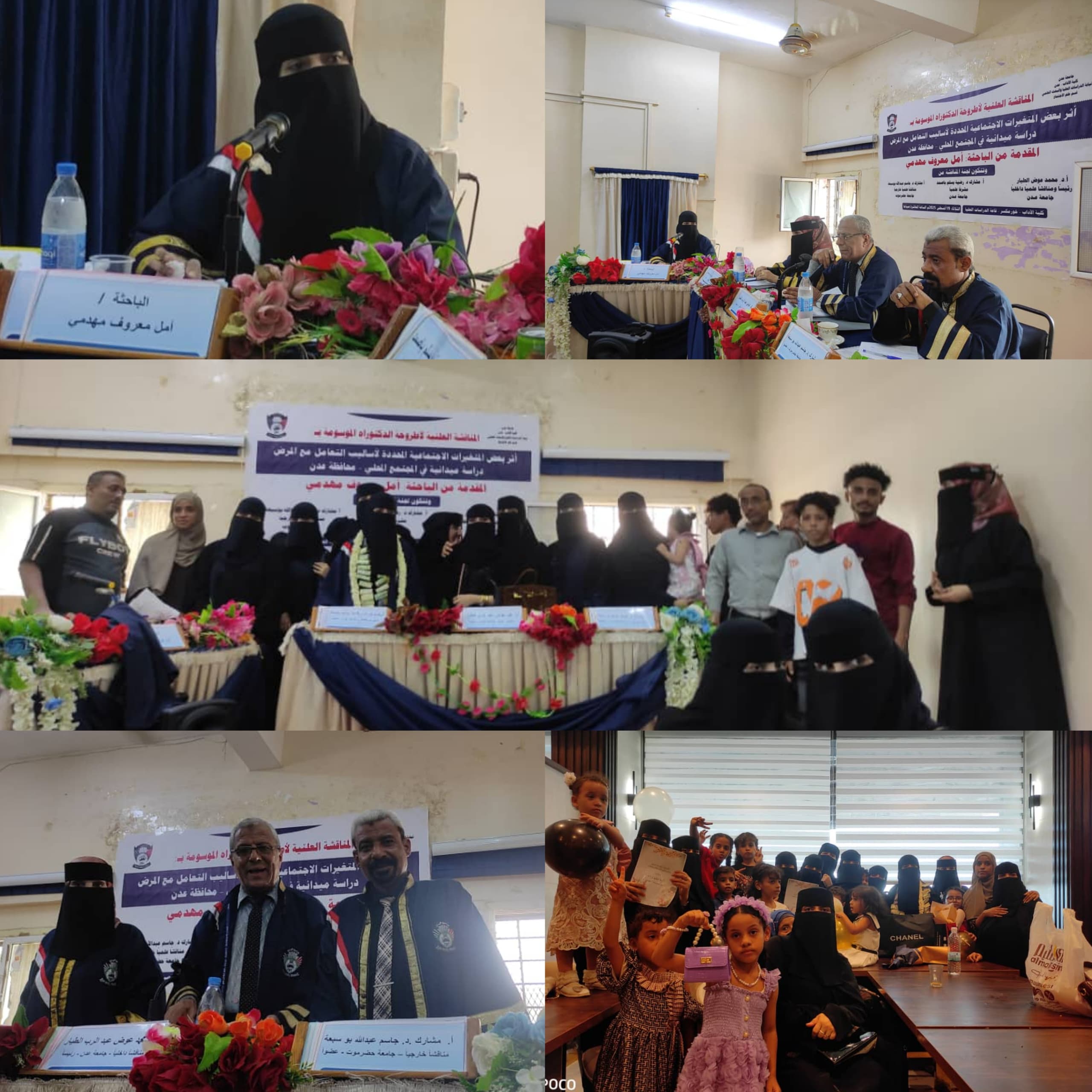 عُقدت في كلية الآداب بجامعة عدن،اليوم المناقشة العلنية لأطروحة الدكتوراه الموسومةب “أثر بعض المتغيرات الاجتماعية المحددة لأساليب التعامل مع المرض دراسة ميدانية في المجتمع المحلي – محافظة عدن” المقدمة من الباحثة : أمل معروف مهدمي.