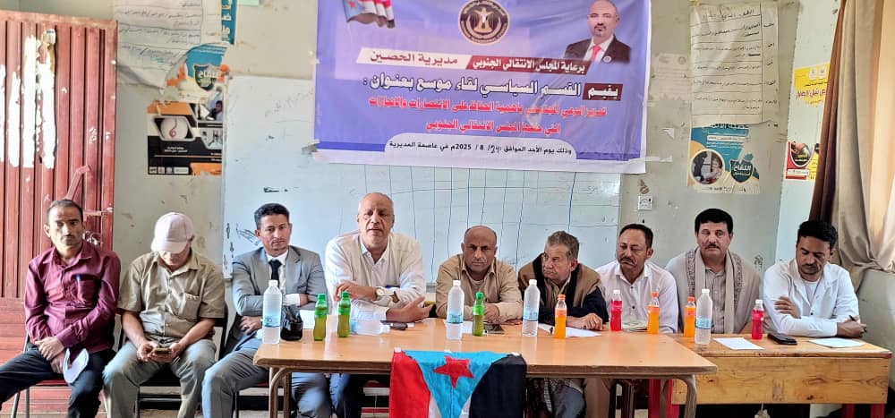 نظّم القسم السياسي في الهيئة التنفيذية للقيادة المحلية للمجلس الانتقالي الجنوبي مديرية الحصين محافظة الضالع، صباح اليوم الأحد، 24 أغسطس 2025م لقاءً موسعًا بعنوان “تعزيز الوعي المجتمعي بأهمية الحفاظ على الانتصارات والإنجازات التي حققها المجلس الانتقالي الجنوبي”، وذلك برعاية القيادة المحلية للمجلس في المديرية، وبمشاركة عدد من القيادات السياسية والنخب المجتمعية والأكاديمية.