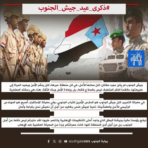 “كل عام وجيشنا الجنوبي بخير.. درعاً حصيناً للوطن، وحامياً لمكتسباته، ورمزاً لعزته وكرامته.”