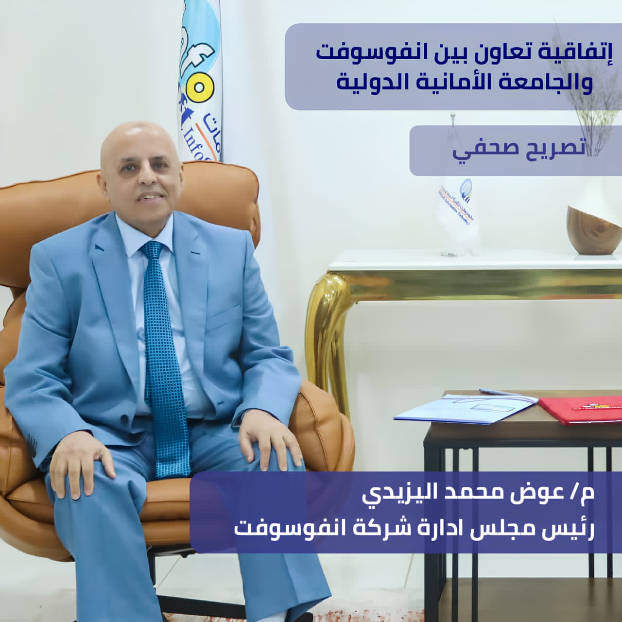 أعرب المهندس عوض محمد اليزيدي رئيس مجلس إدارة شركة. انفوسوفت لتقنية المعلومات عن بالغ سعادته بتوقيع اتفاقية التعاون مع الجامعة الألمانية الدولية مؤكدًا أن هذه الاتفاقية تمثل خطوة مهمة في سبيل ربط التعليم بسوق العمل وتمنح الطلبة فرصا عملية تعزز من جاهزيتهم لمتطلبات السوق وتساهم في بناء جيل مؤهل وقادر على المنافسة.