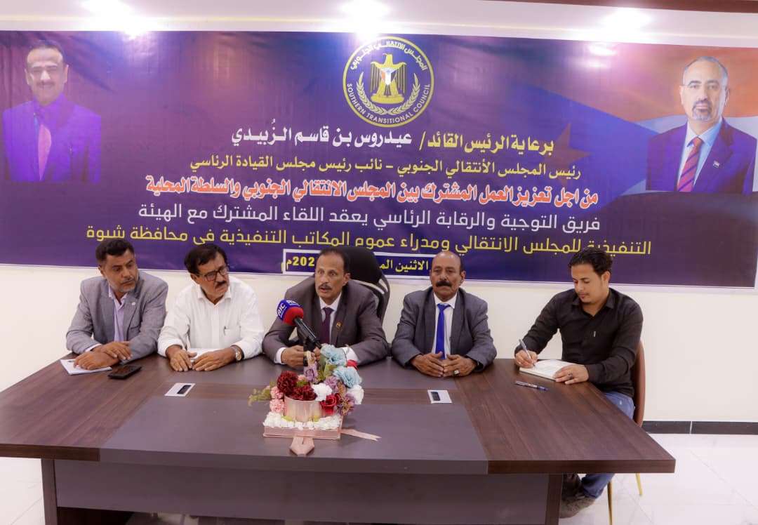 وكان رئيس تنفيذية انتقالي شبوة، قد تحدث بكلمة في مستهل اللقاء رحب من خلالها بالحاضرين، مؤكداً على أهمية هذا اللقاء للاطلاع عن قرب على سير العمل والإنجازات، مشيراً الى أهمية العمل المشترك في تجاوز التحديات، وبما يسهم في الارتقاء بدور المجلس وخدمة أبناء المحافظة.