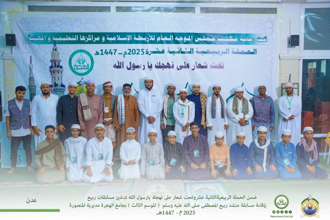 في مساءٍ يشرق بأنوار الذكر والمدائح النبوية، وضمن الحملة الربيعية الثانية عشر وتحت شعار «على نهجك يا رسول الله»، دشّنت مؤسسة الهجرة الخيرية للتنمية عصر يوم السبت 14 ربيع الأول 1447هـ الموافق 6 سبتمبر 2025م، باكورة مسابقات ربيع لهذا العام بإقامة مسابقة “منشد ربيع المصطفى صلى الله عليه وسلم ” – الموسم الثالث، وذلك في رحاب جامع الهجرة بمديرية المنصورة.