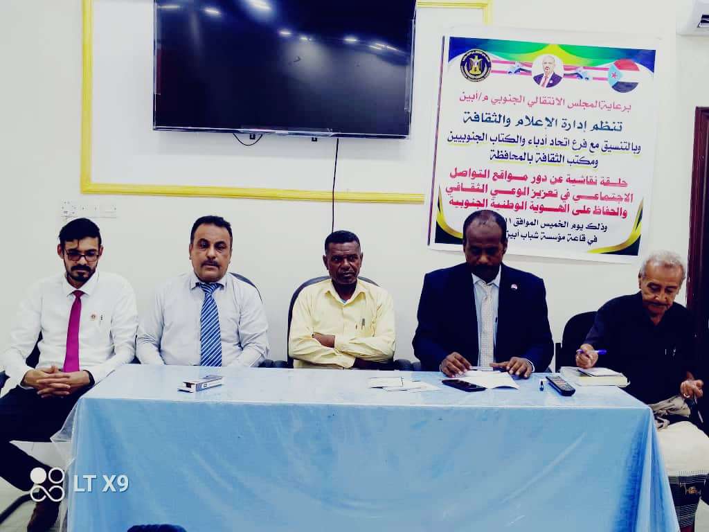 نظّمت إدارة الإعلام والثقافة بالهيئة التنفيذية للقيادة المحلية للمجلس الانتقالي الجنوبي بمحافظة أبين، اليوم الخميس، بالتنسيق مع فرع اتحاد الأدباء والكتاب الجنوبيين ومكتب الثقافة بالمحافظة، حلقة نقاشية بعنوان: “دور مواقع التواصل الاجتماعي في تعزيز الوعي الثقافي والحفاظ على الهوية الوطنية الجنوبية”.