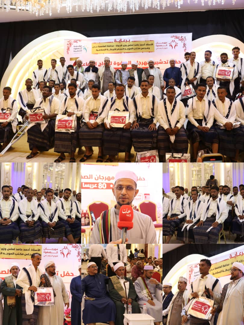شهدت مدينة عدن حفلا مميزا اتحدت فيها القلوب في عرس جماعي بهيج بنسخته السابعة “مهرجان الصفوة للزواج الجماعي” توّجت الفرحة فيه بزفاف عدد 80 عريسا وعروس في لوحة اجتماعية وإنسانية عكست أصالة التلاحم والتكافل بين أبناء المجتمع.الذي جاء برعاية الاستاذ احمد حامد لملس وزير الدولة محافظ العاصمة عدن ومجلس مكتب الموجه العام للاربطة الاسلامية.