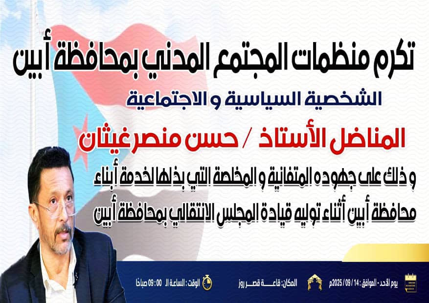 دعت اللجنة التحضيرية للحفل التكريمي للأستاذ حسن غيثان، رئيس المجلس الانتقالي بمحافظة أبين سابقًا، كافة أبناء المحافظة إلى الحضور والمشاركة الفاعلة في الحفل التكريمي الذي سيُعقد في قاعة روز صباح يوم غدٍ الأحد الساعة التاسعة صباحًا.