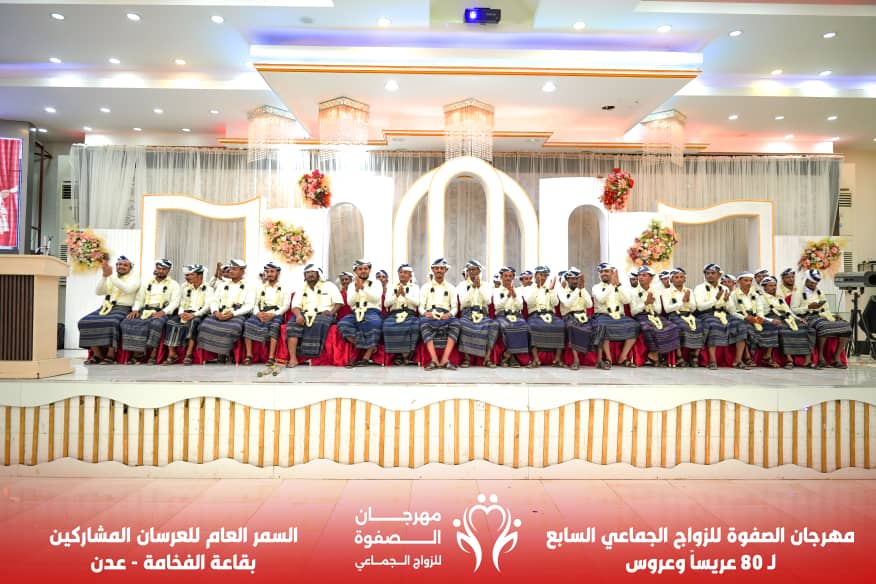 سعادة غامرة، وفرحة عارمة، تُوّج بها مهرجان الصفوة للزواج الجماعي في عامه السابع على التوالي لـ 80 عريسًا وعروسًا بالعاصمة عدن، يوم أمس الإثنين، 15 /9/ 2025م، والذي أقيم على مدى ثلاثة أيام متتالية، احتوى على عدد من الفعاليات الفرائحية المختلفة، برعاية الأستاذ أحمد لملس، وزير الدولة، محافظ العاصمة عدن، ومجلس مكتب الموجه العام للأربطة الإسلامية، وتنظيم مؤسسة الصفوة للتنمية.