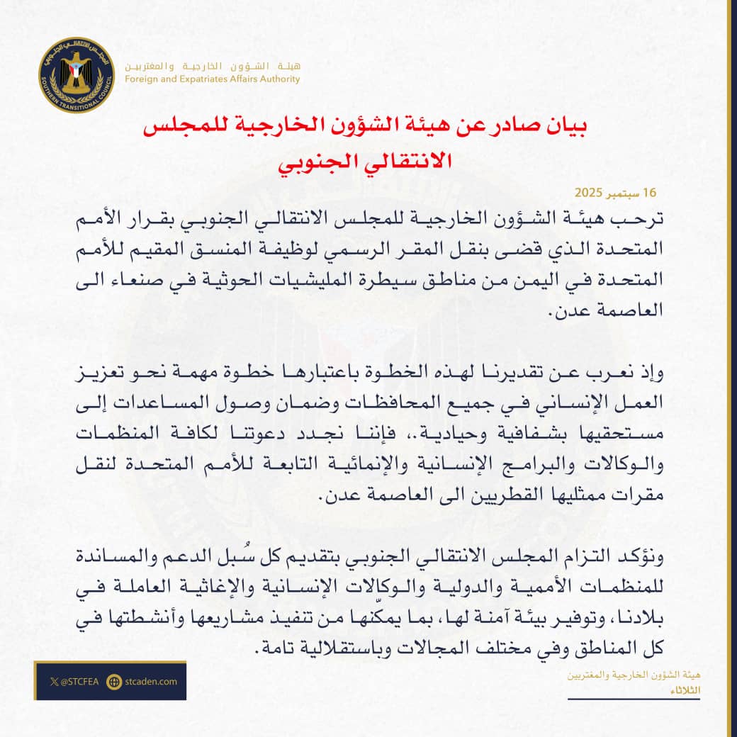 رحبت هيئة الشؤون الخارجية في المجلس الانتقالي الجنوبي بقرار الأمم المتحدة نقل المقر الرسمي لوظيفة المنسق المقيم للأمم المتحدة في اليمن من صنعاء إلى العاصمة عدن، معتبرة إياه خطوة مهمة نحو تعزيز العمل الإنساني وضمان شفافية إيصال المساعدات إلى مستحقيها في جميع المحافظات.
