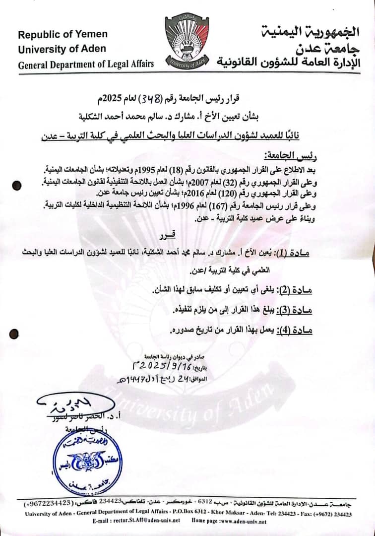 وجاء في سياق التهنئة ” أتقدم بالتهاني والتبريكات إلى الزميل أ.مشارك .دكتور سالم محمد احمد الشكلية لنيله ثقة أ.د. الخضر ناصر لصور رئيس جامعة عدن بتعيينه نائباً للعميد لشؤون الدراسات العليا والبحث العلمي بكلية التربية عدن .
