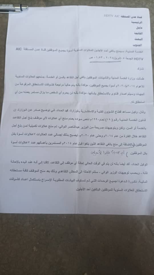 وأوضحوا أنهم سبق وتواصلوا مع الجهات الرسمية لحل مشكلتهم، وكان الرد أن البلاد في حالة حرب، وأن حقوقهم لن تضيع، مؤكدين أنهم سيحالون إلى التقاعد “مشرفين معززين” بكافة مستحقاتهم. إلا أنهم فوجئوا عند صدور قرار وزارة الخدمة المدنية بصرف العلاوات السنوية بحرمانهم منها ومن فوارقها، رغم توجيه الوزير بصرف سبع علاوات لهم أسوة بزملائهم.