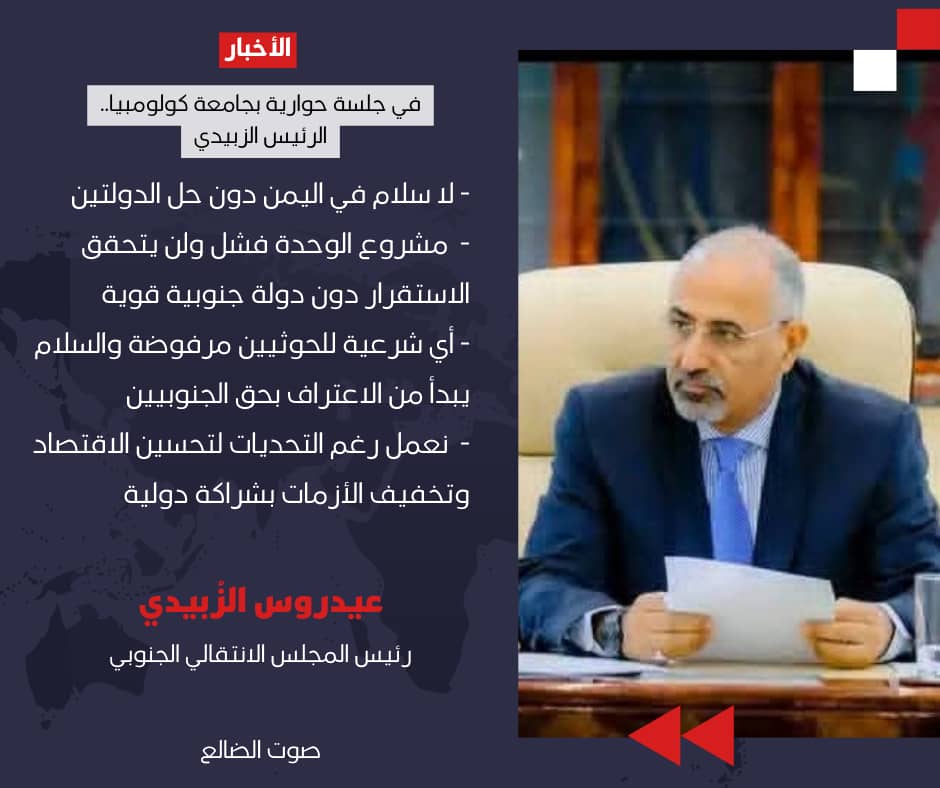 في جلسة حوارية بجامعة كولومبيا.. الرئيس الزُبيدي: لا سلام في اليمن دون حل الدولتين الرئيس الزُبيدي: مشروع الوحدة فشل ولن يتحقق الاستقرار دون دولة جنوبية قوية الرئيس الزُبيدي: أي شرعية للحوثيين مرفوضة والسلام يبدأ من الاعتراف بحق الجنوبيين الرئيس الزُبيدي: نعمل رغم التحديات لتحسين الاقتصاد وتخفيف الأزمات بشراكة دولية #صوت_الضالع