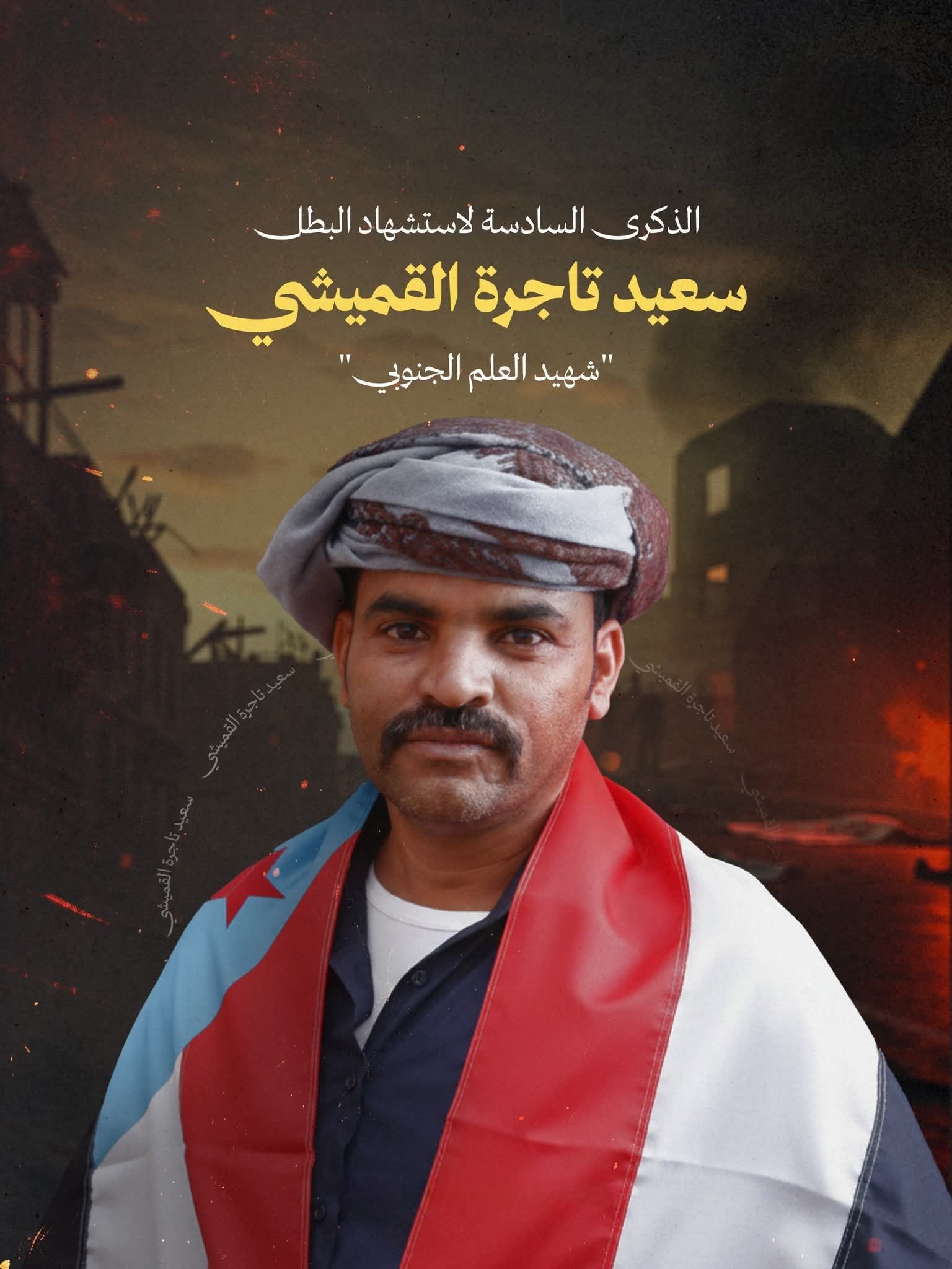 ست سنوات كاملة مرّت على استشهاد إحدى أيقونات الجنوب الخالدة، ذلك الشهيد الحي العالق في أذهان الجنوبيين، وهو الشهيد سعيد تاجرة القميشي الذي طالته يد الغدر مليشيات حزب الأصلاح الإخوانية.