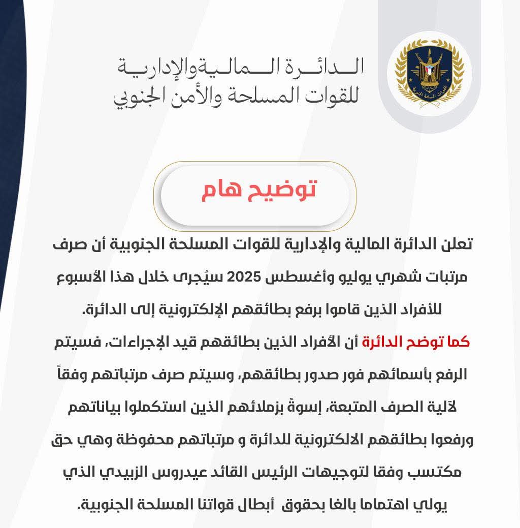 كما توضح الدائرة أن الأفراد الذين بطائقهم قيد الإجراءات، فسيتم الرفع بأسمائهم فور صدور بطائقهم، وسيتم صرف مرتباتهم وفقاً لآلية الصرف المتبعة، إسوةً بزملائهم الذين استكملوا بياناتهم ورفعوا بطائقهم الالكترونية للدائرة و مرتباتهم محفوظة وهي حق مكتسب وفقا لتوجيهات الرئيس القائد عيدروس الزبيدي الذي يولي اهتماما بالغا بحقوق أبطال قواتنا المسلحة الجنوبية
