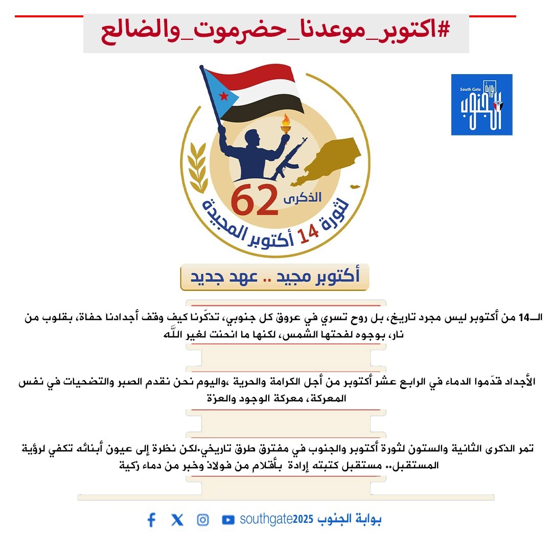 واخيرا إن الذكرى الـ 62 لثورة الـ 14 من أكتوبر ليست مجرد احتفال بالماضي، بل هي تجسيد للإرادة الشعبية الحرة وتأكيد على استمرار المسيرة التحررية. لذا، فإن الواجب الوطني يحتم على كل جنوبي أن يلبي نداء الواجب، ولنجعل من الاحتفالات في حضرموت والضالع تظاهرة شعبية تُرسل رسالة مدوية للعالم بأن شعب الجنوب موحد على مشروع استعادة دولته، فليكن حضوركم تحت شعار أكتوبر مجيد.. عهد جديد، تجديداً للعهد مع الشهداء وتأكيداً على الالتزام ببناء المستقبل الذي يليق بالتضحيات الجسام. ولنصطف جميعا للمشاركة والاحتشاد، فالحرية والسيادة تستمدان قوتهما من صوت الجماهير الحاشد.
