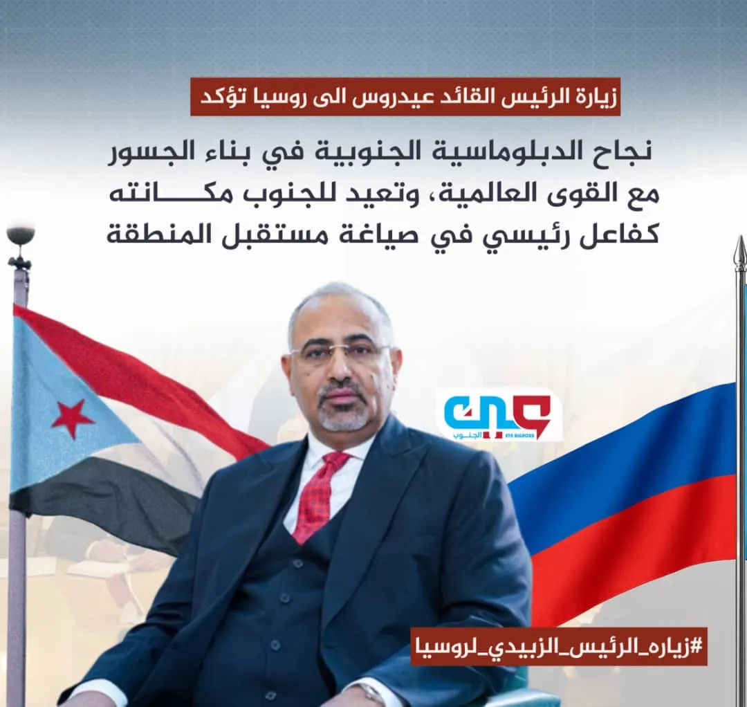 تأتي زيارة الرئيس القائد عيدروس بن قاسم الزُبيدي، رئيس المجلس الانتقالي الجنوبي،نائب رئيس مجلس القيادة الرئاسي إلى جمهورية روسيا الاتحادية كزيارة رسمية تستهدف تعزيز العلاقات الثنائية بين الجنوب وروسيا.