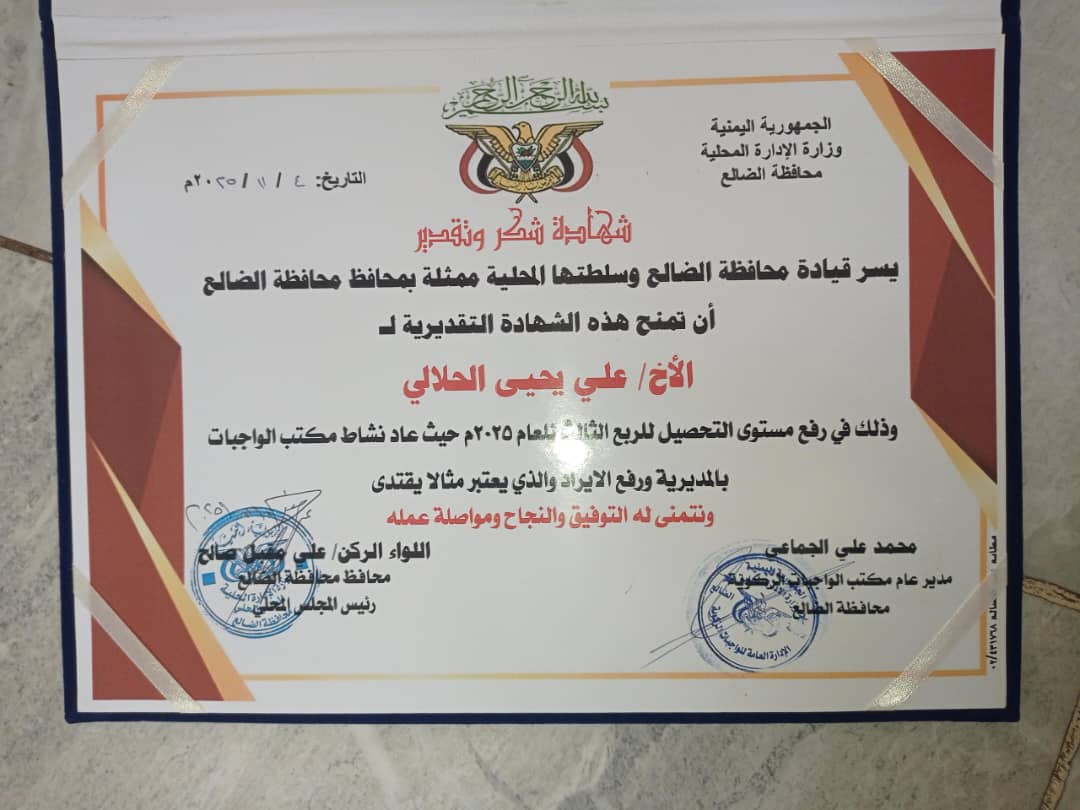 وجرى التكريم من قبل محافظ محافظة الضالع اللواء علي مقبل صالح، الذي منح الأستاذ الحلالي شهادة تقدير تثميناً لدوره المتميز في تطوير أداء مكتب الواجبات الزكوية بالمديرية، وتمكنه من تحقيق زيادة ملحوظة في الإيرادات خلال الربع الثاني من العام 2025م.