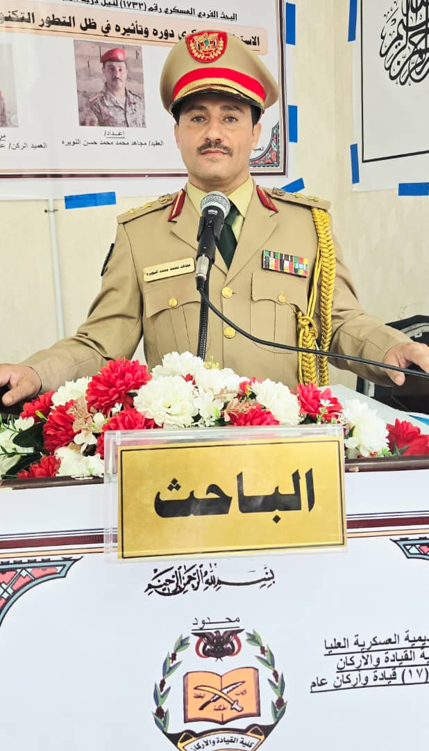 ناقش العقيدالركن/مجاهد محمد محمد حسن النويره، بحثه العلمي بعنوان “الاستطلاع العسكري: دوره وتأثيره في ظل التطور التكنولوجي الحديث”، في إطار دراسته العليا في الأكاديمية العسكرية العليا.