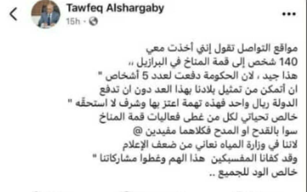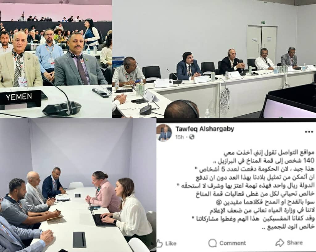 في مشهد يعكس فجوة متعمدة بين التصريحات والوقائع، خرج وزير المياه والبيئة اليمني المهندس توفيق الشرجبي بتصريح رسمي يؤكد أن مشاركة اليمن في مؤتمر المناخ بالبرازيل 2025 “اقتصرت على خمسة مشاركين فقط”. لكن هذا التصريح لم يكن سوى رد فعل على كشف سبق أن نشره الباحث عبدالقادر الخراز، الذي وثق 8 كشوفات رسمية من وزارة المياه والبيئة نفسها، تضم 140 اسمًا مسجلاً للمؤتمر.