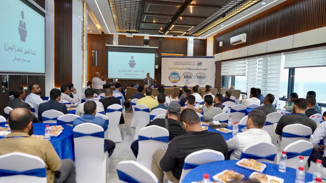 وسلّم ممثل منظمة الآيزو “كريم أحمدي” شهادة الجودة العالمية ISO لمدير عام الشركة فرع اليمن محمد صالح الجحافي، وسط ابتهاج الحاضرين بهذه اللحظة التي طال انتظارها.