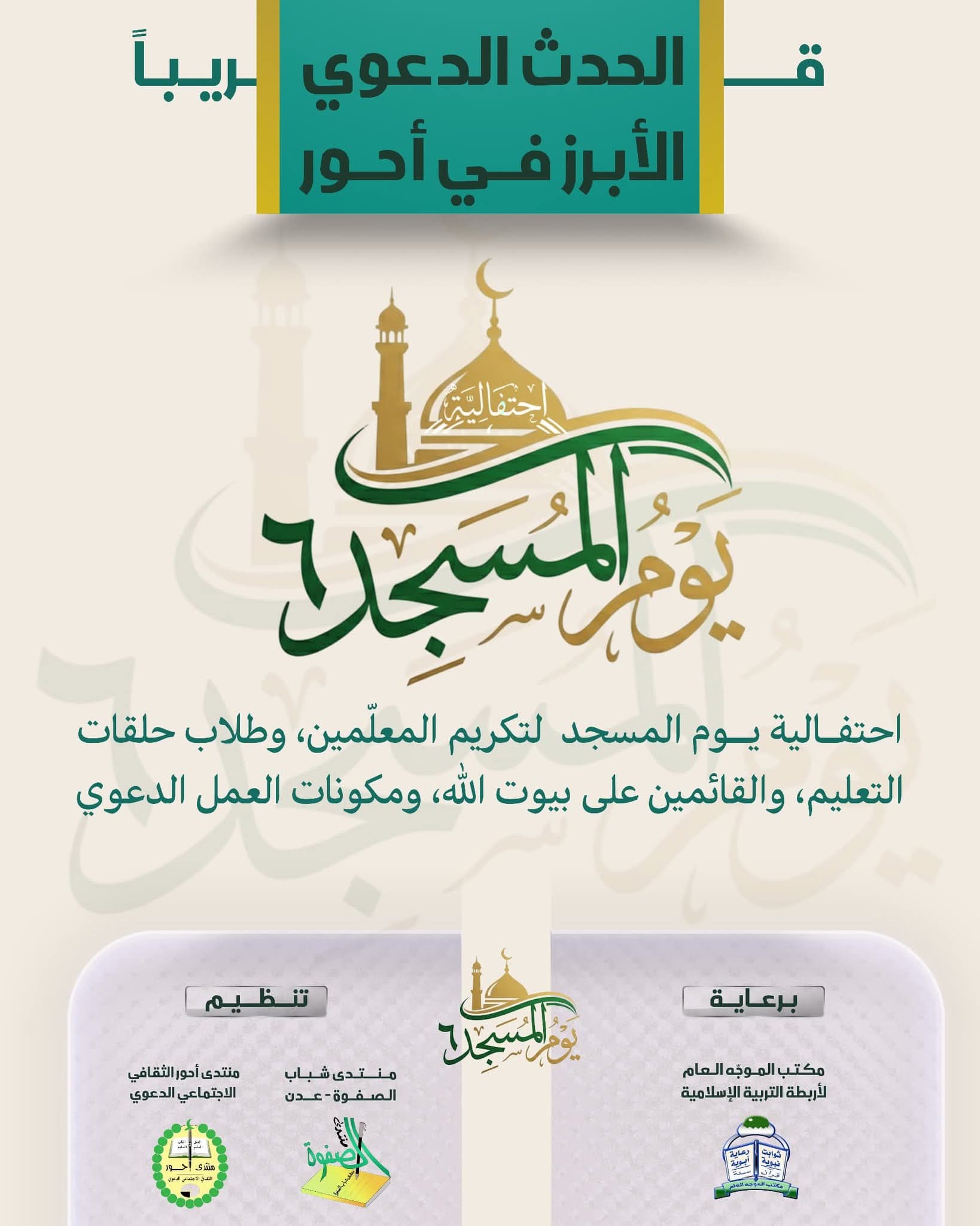 تقام فعاليات يوم المسجد في مدينة أحور للمرة السادسة على التوالي، بدعم من منتدى شباب الصفوة بمدينة عدن، وتنظيم منتدى أحور الثقافي الاجتماعي الدعوي، وبرعاية مجلس مكتب الموجه العام لأربطة التربية الإسلامية ومراكزها التعليمية والمهنية.
