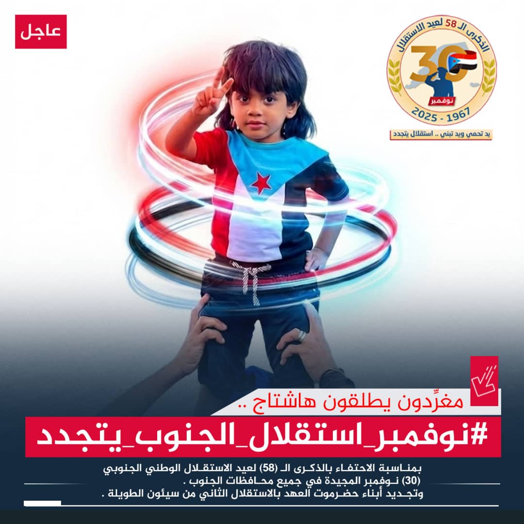 شهد عصر يومنا هذا السبت الموافق 29 نوفمبر / تشرين الثاني 2025م، انطلاق حملة إلكترونية وإعلامية واسعة النطاق تحت وسم #نوفمبر_استقلال_الجنوب_يتجدد، بتدشين من ناشطين إعلاميين وسياسيين جنوبيين، وتأتي هذه الحملة تزامنا مع حلول الذكرى الثامنة والخمسين لعيد الاستقلال الوطني المجيد، الـ (30) من نوفمبر، بهدف حشد أبناء شعب الجنوب العربي للاحتفاء بهذه الذكرى العظيمة وتجديد الثقة والموقف خلف القيادة السياسية.