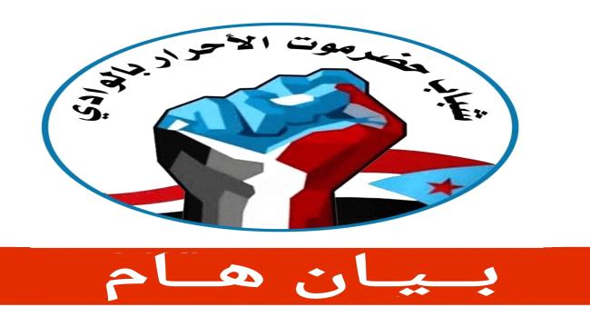 إننا نحن شباب حضرموت الأحرار بالوادي نعرب عن غضبنا الشديد وندين بأقسى وأشد العبارات ما شهدته مناطق الوادي منذ ساعات الصباح وحتى العصر من اعتقالات تعسفية طالت الشباب المعتصمين سلمياً إضافة إلى إطلاق نار كثيف ومباشر على المواطنين العُزّل في اعتداء فاضح وصادم يناقض كل القوانين والأعراف الإنسانية.