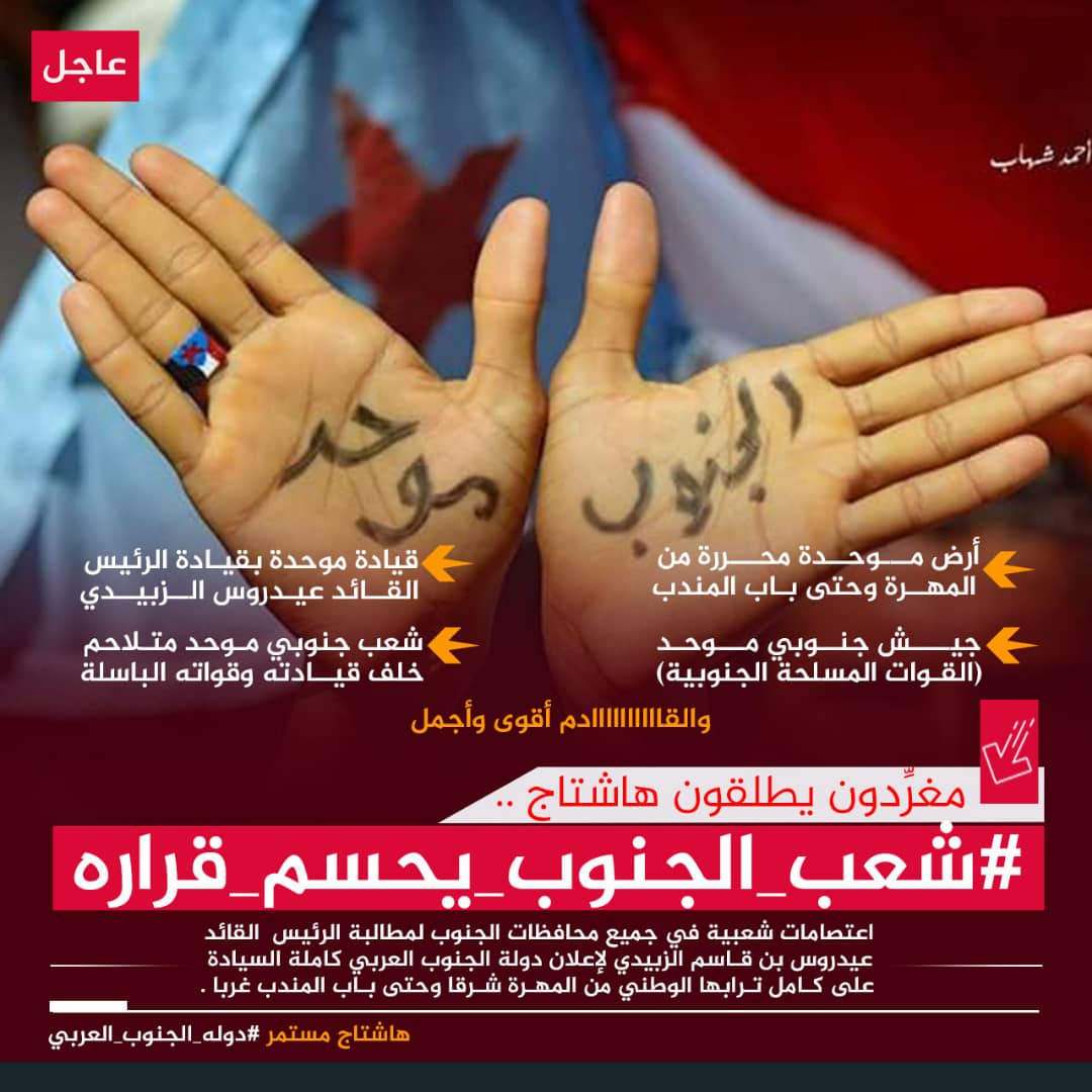 أطلق نشطاء وإعلاميون جنوبيون، عند الساعة الخامسة من عصر اليوم الأحد، حملة إلكترونية وإعلامية تحت وسمي #شعب_الجنوب_يحسم_قراره و #دوله_الجنوب_العربي، وذلك في إطار حراك شعبي ورسمي واسع يؤكد مطالب أبناء الجنوب العربي بإعلان دولتهم المستقلة كاملة السيادة.