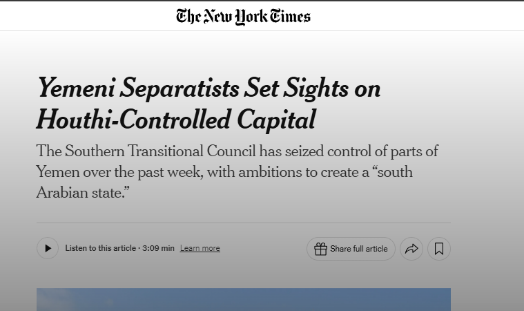 نشرت صحيفة نيويورك تايمز تقريرًا موسّعًا عن التطورات المتسارعة في جنوب اليمن، معتبرة أن المجلس الانتقالي الجنوبي انتقل من إدارة صراع محلي في الجنوب إلى وضع صنعاء، الخاضعة لسيطرة الحوثيين، ضمن أهدافه العسكرية والسياسية المباشرة.