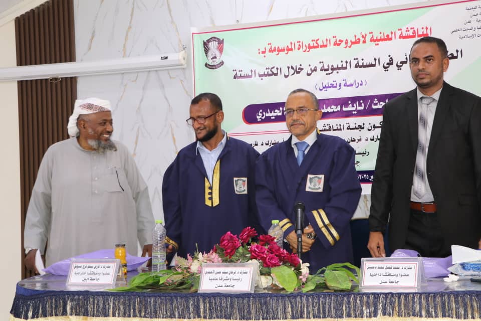 ناقش صباح اليوم الخميس الموافق 11 ديسمبر 2025م الباحث نايف محمد علي مانع الحيدري أطروحته للدكتوراه الموسومة بـ (الطب الوقائي في السنة النبوية من خلال الكتب الستة) وذلك في كلية التربية – جامعة عدن، نيابة الدراسات والبحث العلمي، قسم الدراسات الإسلامية.