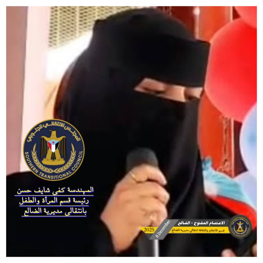 وجددت المهندسة كفى شايف حسن رئيسه قسم المرأة والطفل بانتقالي مديرية الضالع دعوتها لكل حرائر الضالع و الجنوب إلى مواصلة تعزيز دور المرأة الجنوبية وحضورها الوطني في المشاركة الفاعلة في المسيرة النضالية لشعب الجنوب وحشد كل الطاقات للحركة النسوية الجنوبية في سبيل تحقيق الهدف المنشود لشعب الجنوب العربي والمطالبة باستعادة دولتة كهدف استراتيجي ومشروع لا يقبل التأجيل