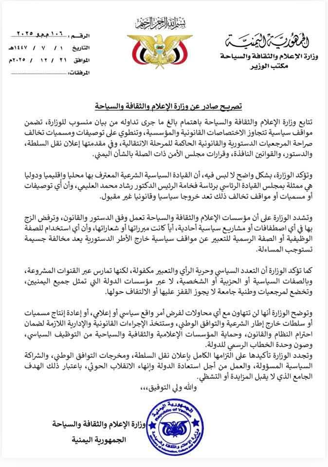 إنَّ القيادة السياسية الشرعية، المعترف بها محليًا وإقليميًا، هي تلك التي تقف على أرضها وتحمي مكتسباتها ومؤسساتها، وتتحمل المسؤولية وتقاسي الصعاب، وليست تلك التي تُدار عبر تطبيقات الهواتف ومواقع التواصل. وهي وزارة تمثل الإعلام تعمل على إبراز رئيس مجلس القيادة الذي أتى بطريق توافقية وتسيء لبقية الأعضاء ، وكأن مهمة الوزارة حكرًا لتضخيم حكمًا فرديًا مُطلقًا؛ فإذا كان أعضاء هذا المجلس الرئاسي من الجنوبيين– بحسب زعم البيان – لا سلطة لهم، فكيف قبل الوزير المفسبك والمهتم بالتغريدات الموجهة لأطراف شركاء بالشرعية وهم أساسًا الشرعية أن يقبل بنائبٍ له وهو معُين بقرار من أحد أعضاء هذا المجلس؟ أليس في هذا التناقض إقرارٌ ضمني بالواقع الجديد؟