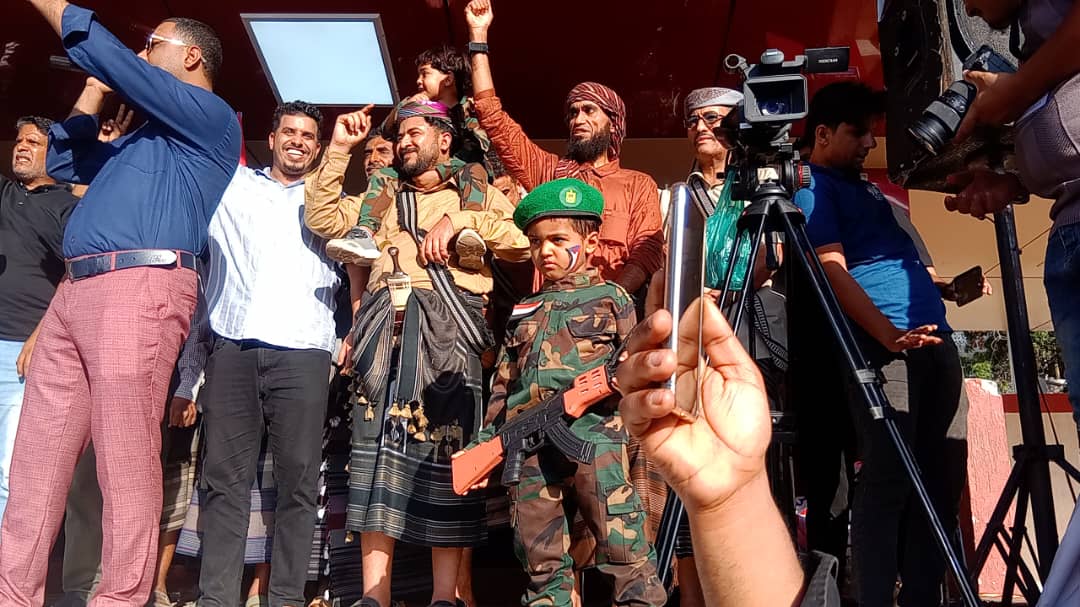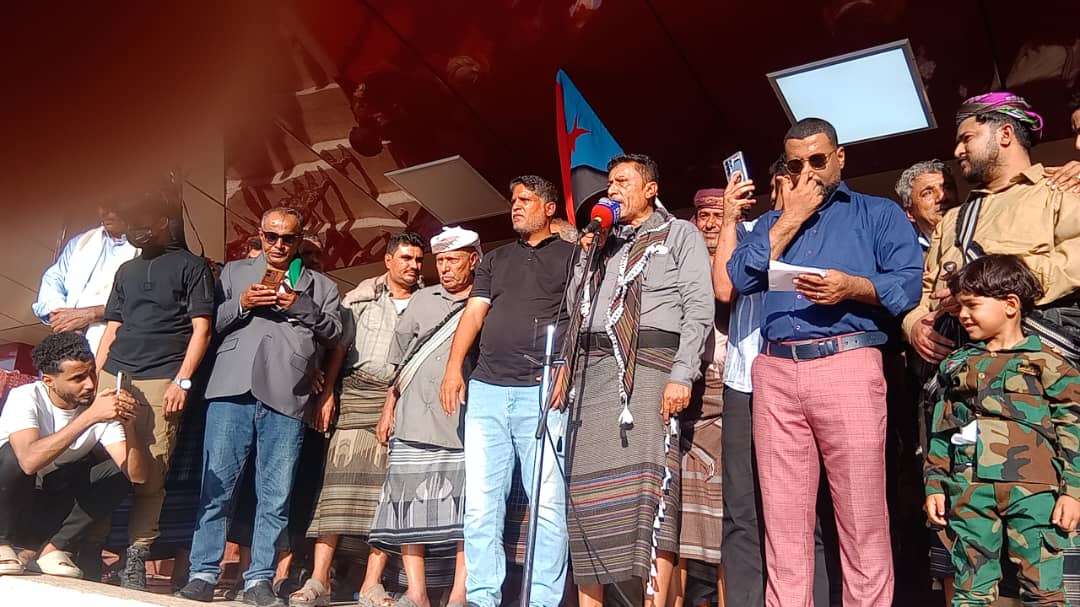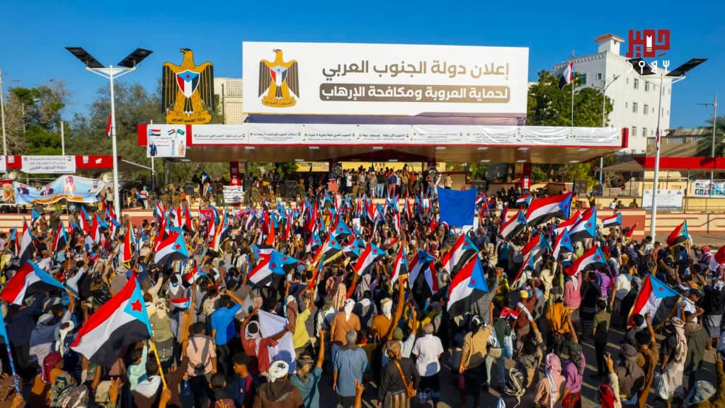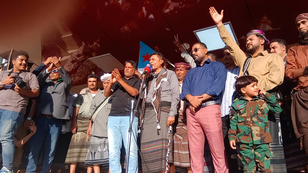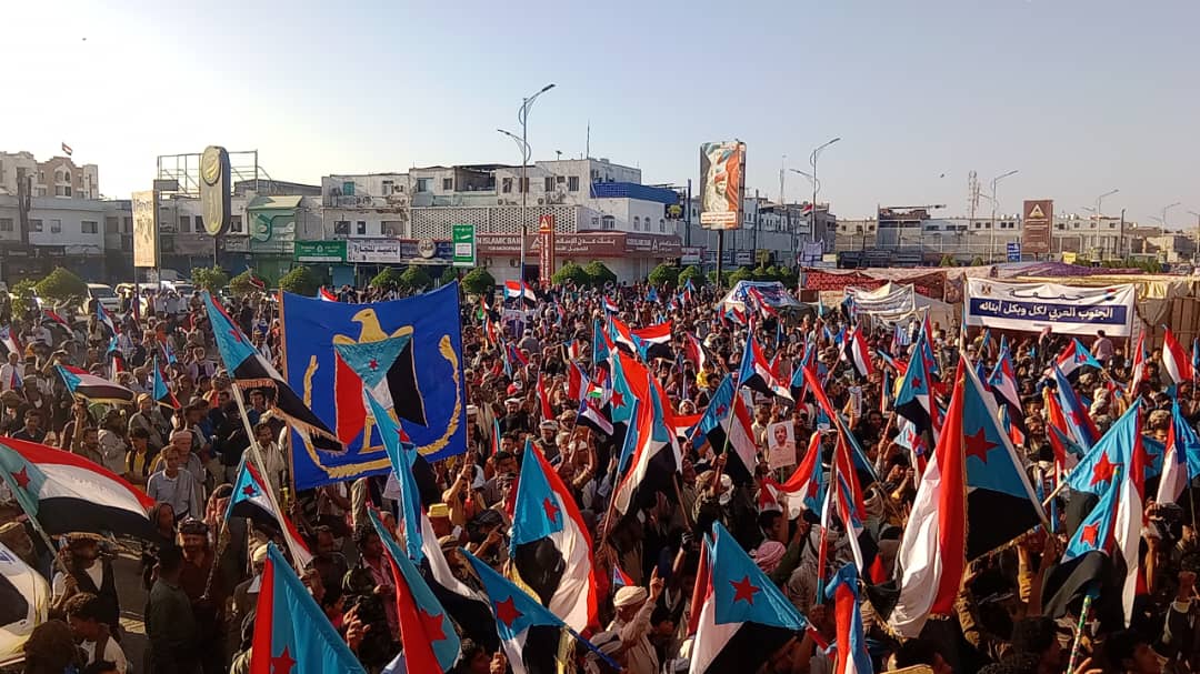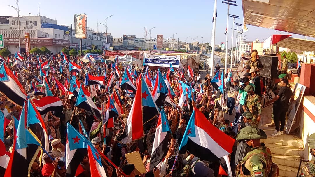 الحشود الجماهيرية وصلت ساحة العروض بخور مكسر وسط أهازيج وشعارات وطنية جنوبية تؤكد التمسك بالهدف الاستراتيجي والمتمثل في استعادة الدولة الجنوبية كاملة السيادة.