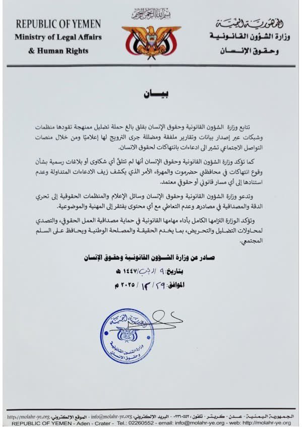 تتابع وزارة الشؤون القانونية وحقوق الإنسان بقلق بالغ حملة تضليل ممنهجة تقودها منظمات وشبكات عبر إصدار بيانات وتقارير ملفقة ومضللة، جرى الترويج لها إعلامياً ومن خلال منصات التواصل الاجتماعي، تتضمن ادعاءات بانتهاكات لحقوق الإنسان.