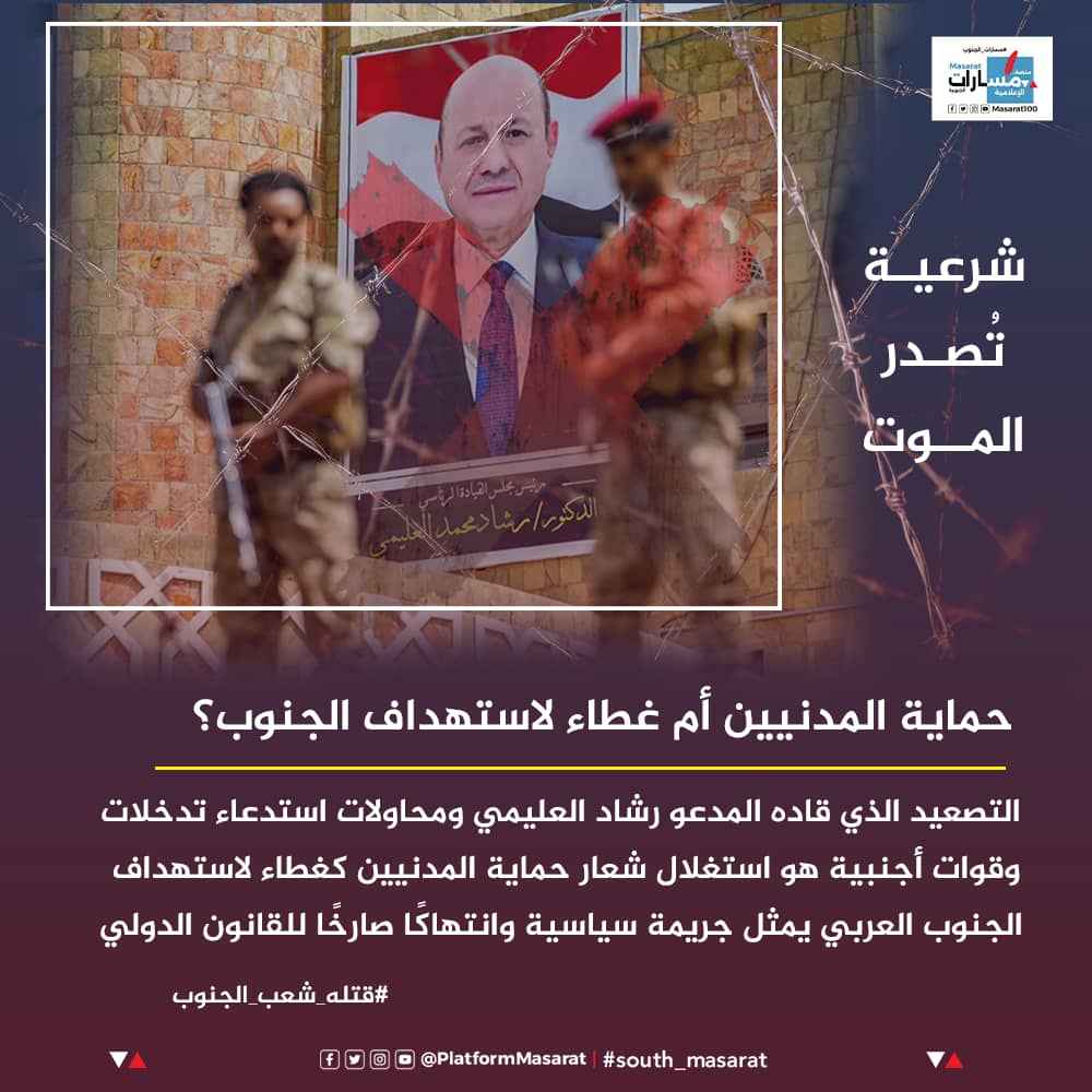 وفي هذا السياق شددَ ناشطون جنوبيون: “ما يطرحه العليمي ليس مشروع سلام ‘ بل محاولة لإعادة إنتاج سُلطة فشلت في إدارة البلاد ‘ عبر تحميل الجنوب ثمن هذا الفشل ‘ مؤكدين بأن القرارات الأخيرة لا تحمي “المركز القانوني لليمن ” بل تعمّق أزمته وتكشف هشاشته وتدفع نحو مزيد من الانقسام.