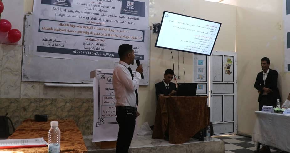 نظمت كلية العلوم الإدارية والإنسانية، قسم إدارة الأعمال، بجامعة خليج عدن الدولية، صباح اليوم الأربعاء الموافق 14 يناير 2026م، المناقشة العلنية لمشاريع التخرج لطلبة الدفعة الرابعة بكالوريوس إدارة أعمال، ضمن دفعتي «قادة الاقتصاد ورواد الاستثمار» و«المستقبل الواعد»، وذلك بحضور رسمي وأكاديمي واسع.