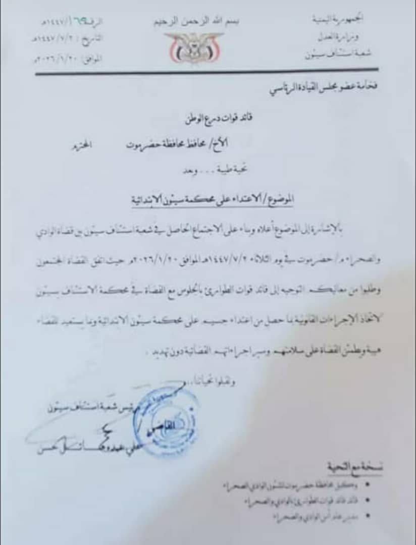 وتأتي هذه الواقعة في سياق تصاعد القلق الشعبي من محاولات فرض النفوذ العسكري الشمالي على المؤسسات المدنية في وادي حضرموت، وسط مطالبات متزايدة بإخضاع جميع التشكيلات المسلحة للقانون، وتجنيب القضاء أي ضغوط أو اعتداءات تمسّ استقلاله ودوره كضامن للعدالة.