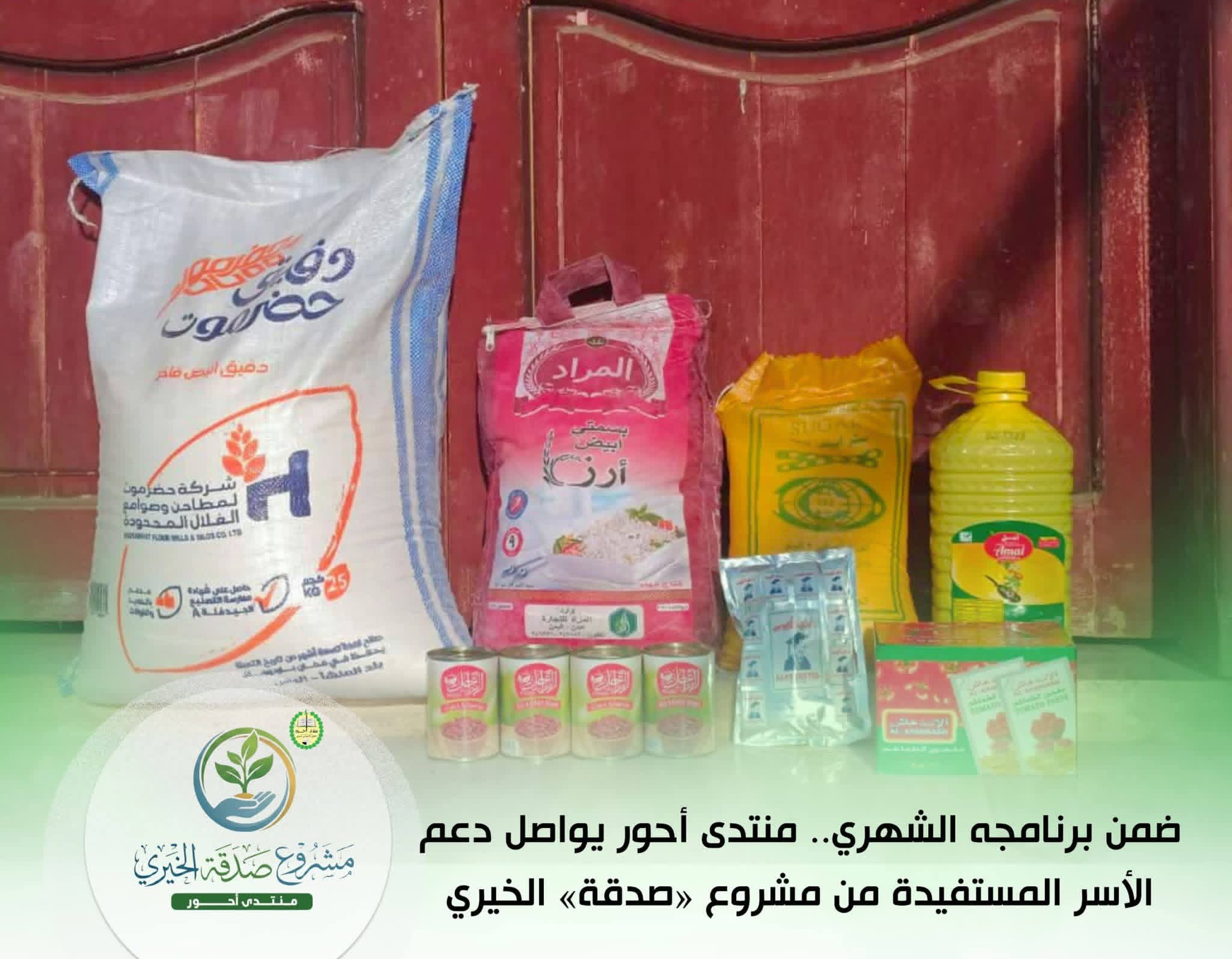 يواصل منتدى أحور الثقافي الاجتماعي الدعوي، وللشهر الثالث على التوالي، عطائه المجتمعي من خلال دعم الأسر المستفيدة من مشروعه الإنساني «صدقة» الخيري، الذي يستهدف عددًا من الأسر الفقيرة المتعففة في مديرية أحور، بدعم من فاعلي الخير.