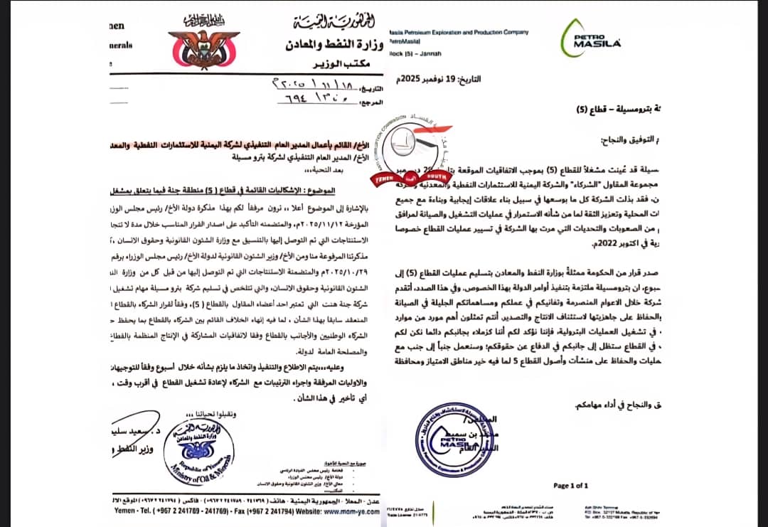 ‏كشفت وثائق رسمية عن قيام الشركة اليمنية للاستثمارات النفطية والمعدنية (وايكم) بإصدار توجيهات بنقل تشغيل القطاع النفطي رقم (5) من شركة بترومسيلة الحكومية إلى شركة “جنة هنت” الخاصة، وذلك ابتداءً من 1 يناير 2025، رغم توجيهات رسمية سابقة من رئاسة الوزراء ووزارة النفط بإيقاف أي إجراءات من هذا النوع.
