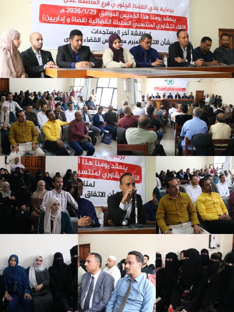 عقد اليوم في العاصمة عدن برعاية نادي القضاة الجنوبي، فرع العاصمة عدن، لقاء تشاوريا لمنتسبي السلطة القضائية قضاة و إداريين لمناقشة آخر المستجدات بشأن الاتفاق المبرم مع مجلس القضاء الأعلى خصص لمناقشة سبل تثبيت استقلالها وتعزيز حقوق منتسبيها.