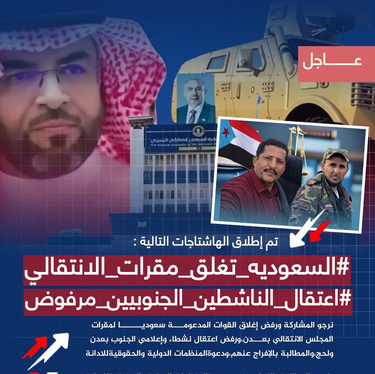أطلق مغردون جنوبيون اليوم الأحد، هاشتاجي السعودية تغلق مقرات الانتقالي، واعتقال الناشطين الجنوبيين مرفوض، تنديدا بإغلاق القوات المدعومة سعوديا لمواقع المجلس الانتقالي الجنوبي في العاصمة عدن، ورفض اعتقال نشطاء وإعلامي الجنوب.
