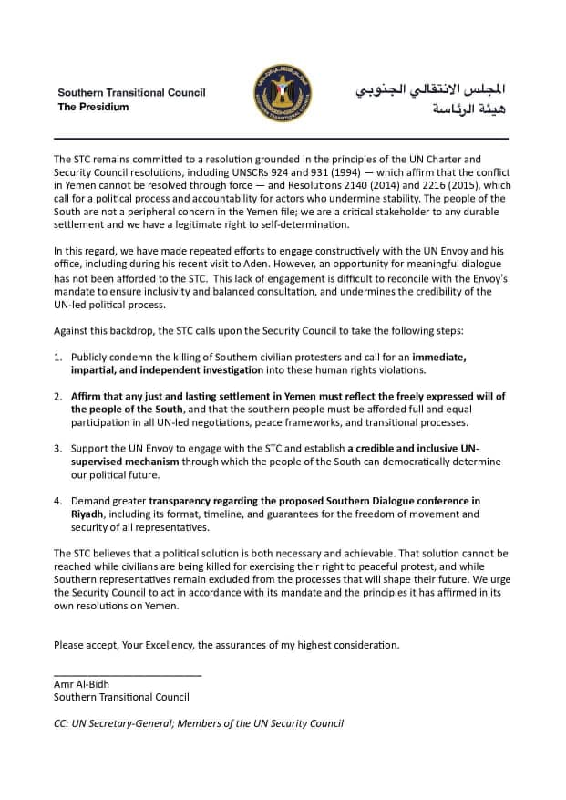 النص الكامل المترجم لرسالة المجلس الانتقالي الجنوبي لـ مجلس الأمن الدولي